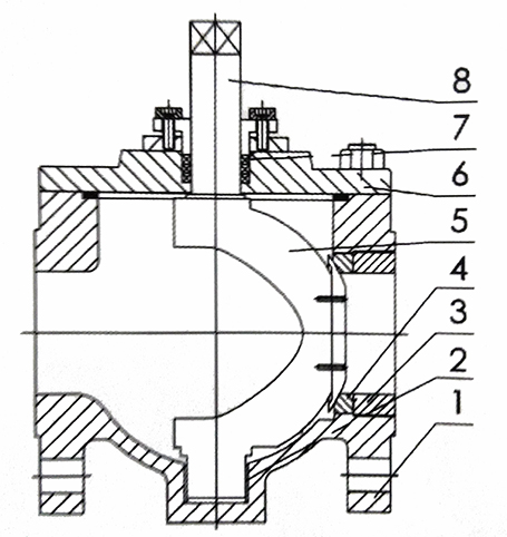 圖中數字注釋:1表示閥體,2表示壓緊圈。3表示軸套,4表示閥座,5表示球冠,6表示閥蓋,7表示填料,8表示偏心軸。