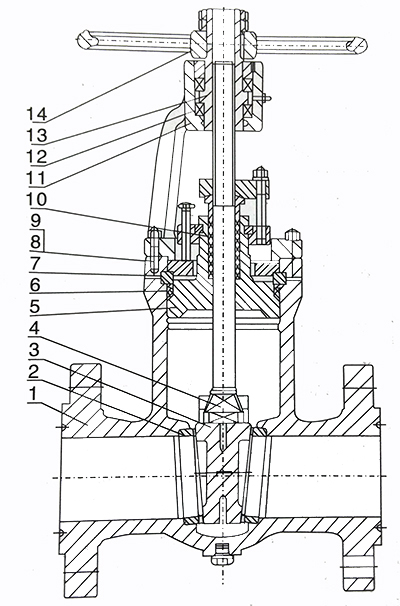 圖中數(shù)字注釋:1表示閥體,2表示閥座,3表示閘板,4表示閥桿,5表示閥蓋,6表示密封圈,7表示四合環(huán),8表示雙頭螺柱,9表示六角螺母,10表示填料,11表示支架,12表示軸承,13表示閥桿螺母,14表示手輪。